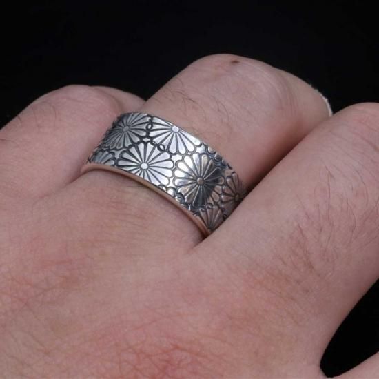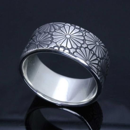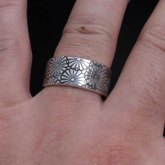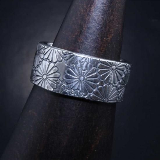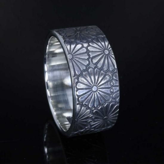 菊紋を指輪いっぱいにスタンプワークしたシルバーリング。