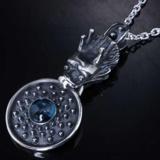 燻しを効かせたシルバーに、幻想的な光を放つブルートパーズが好相性のペンダントトップ。